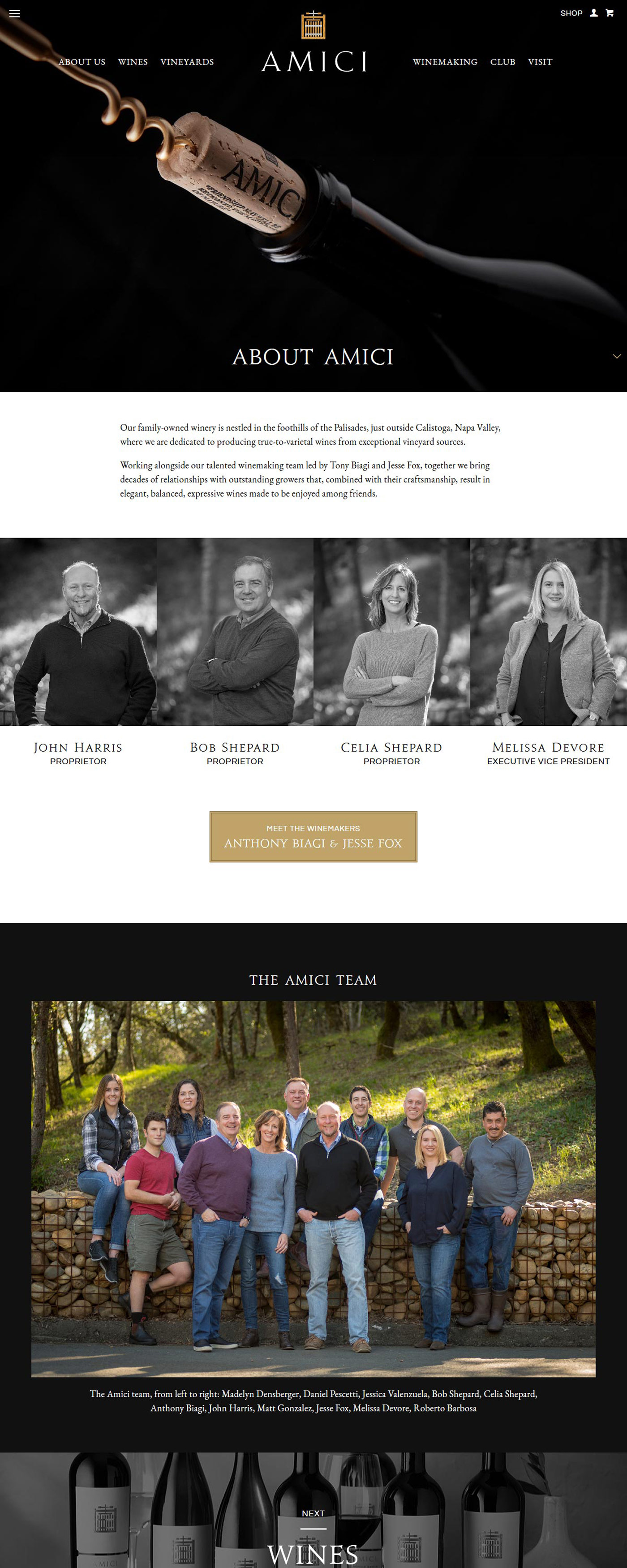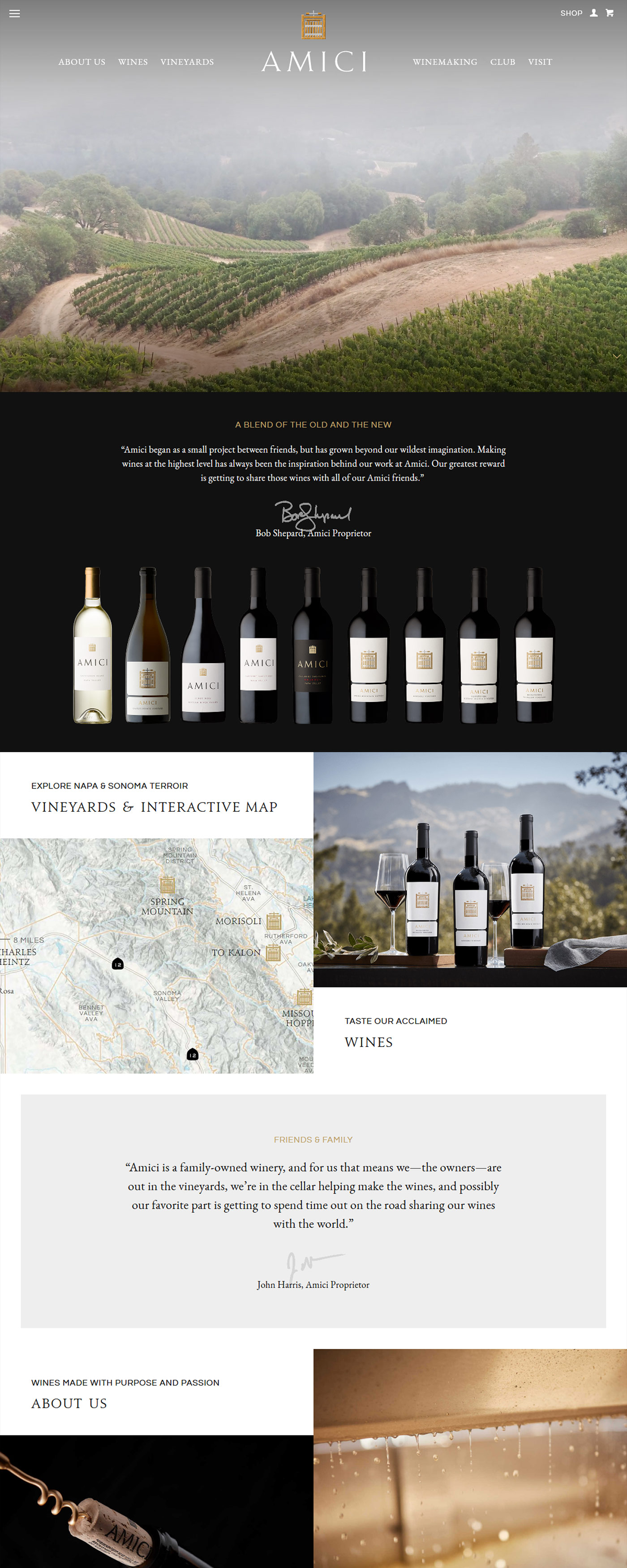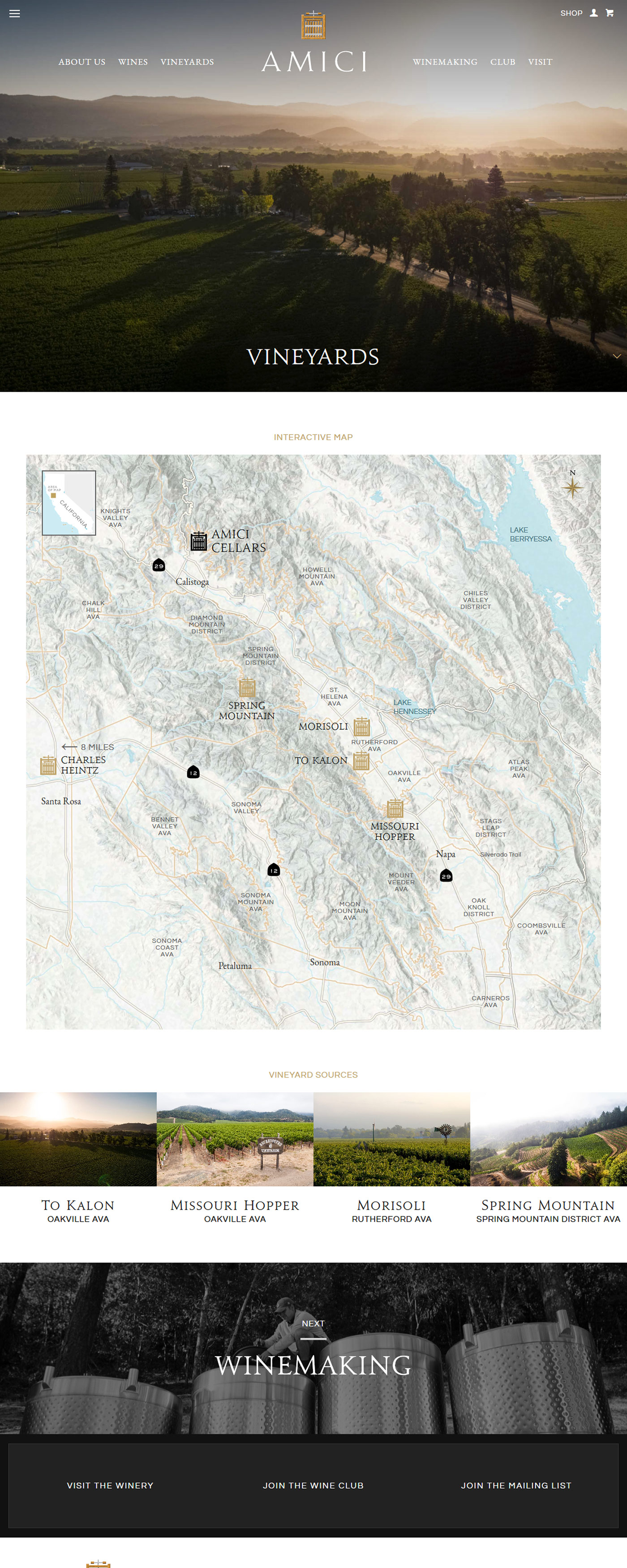 Family-owned Amici Cellars in Calistoga produces critically acclaimed wines from the Napa Valley and Sonoma Coast AVAs. From the flagship Napa Valley blend to the portfolio of single-vineyard wines from Napa and Sonoma’s most coveted heritage, hillside, and valley vineyards, their wines are made with deep respect for vineyard sources and thoughtful attention to detail. This is an older Vin website that still performs admirably, and we are pleased to count Amici Cellars among our ongoing Support Program clients.