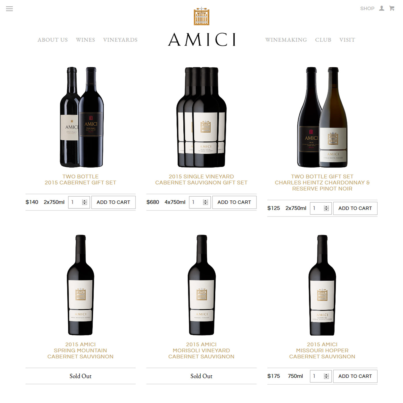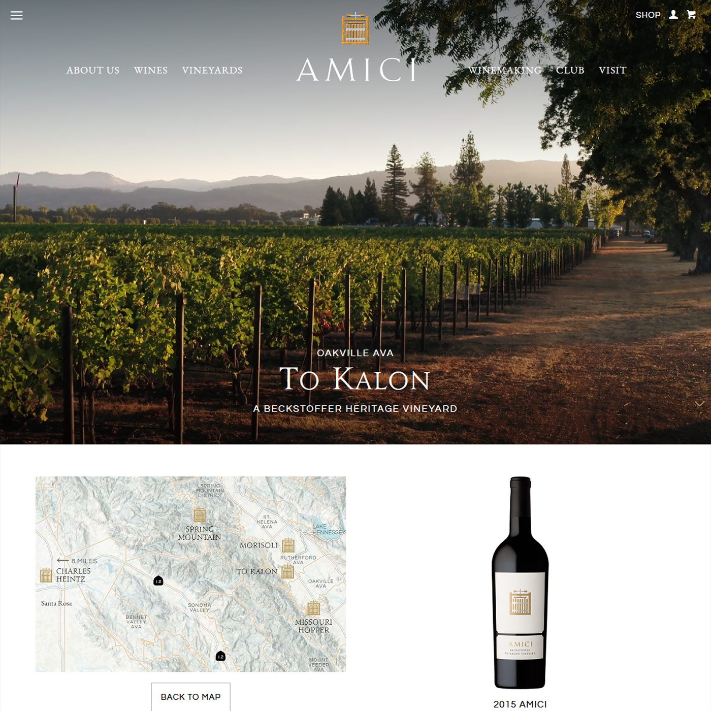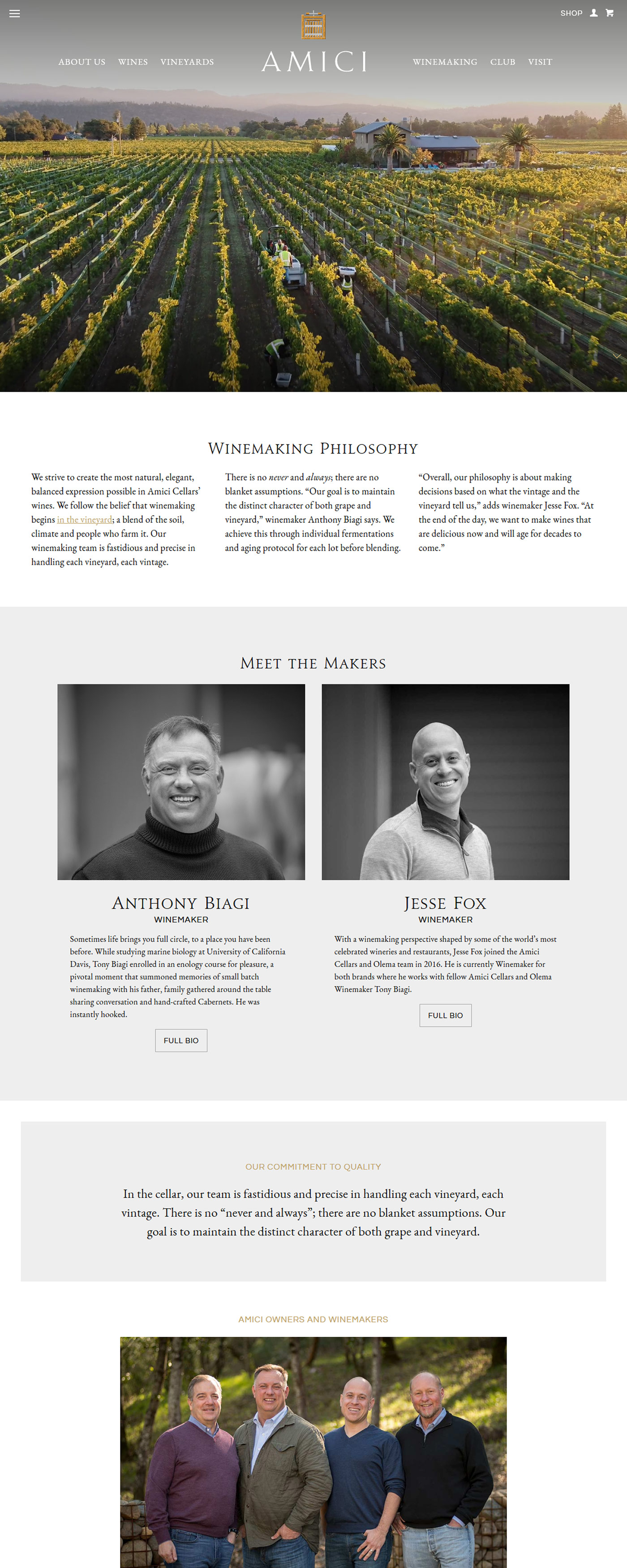 Family-owned Amici Cellars in Calistoga produces critically acclaimed wines from the Napa Valley and Sonoma Coast AVAs. From the flagship Napa Valley blend to the portfolio of single-vineyard wines from Napa and Sonoma’s most coveted heritage, hillside, and valley vineyards, their wines are made with deep respect for vineyard sources and thoughtful attention to detail. This is an older Vin website that still performs admirably, and we are pleased to count Amici Cellars among our ongoing Support Program clients.