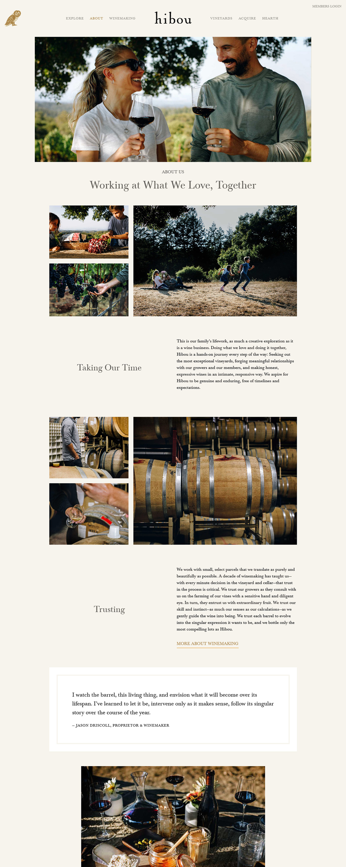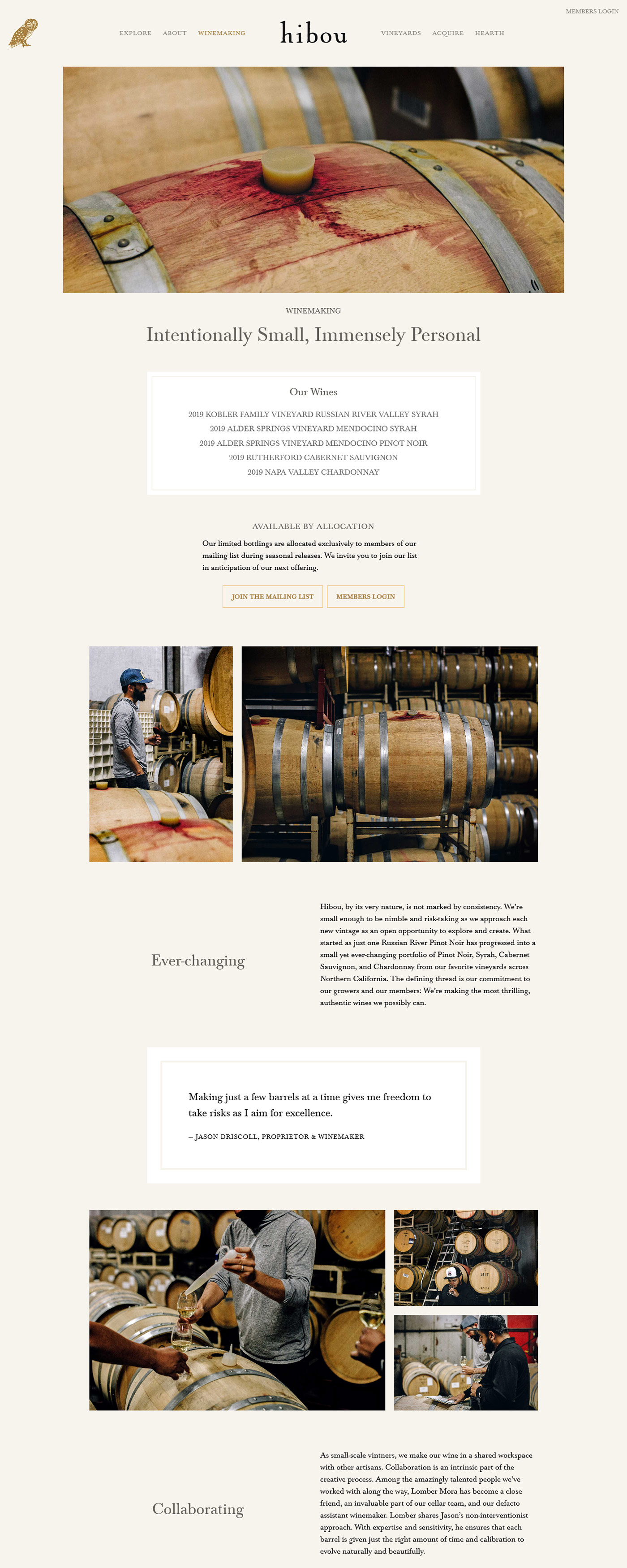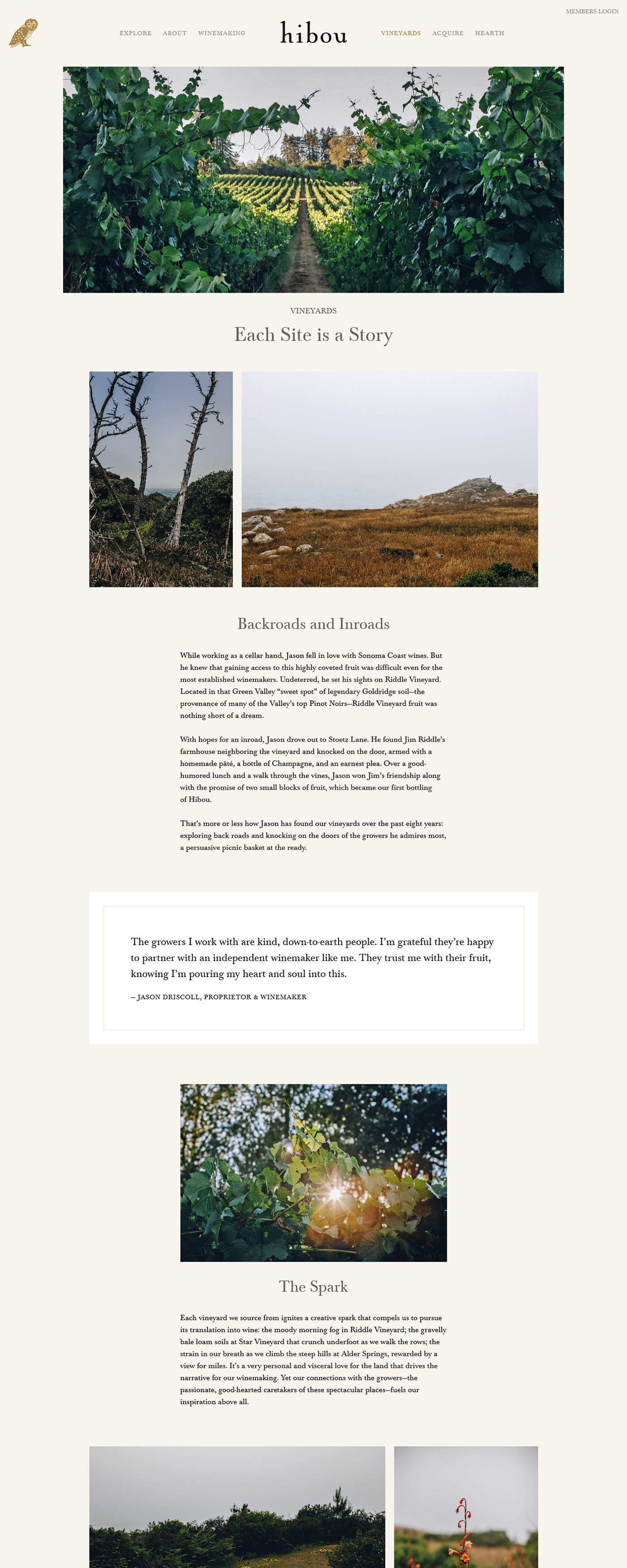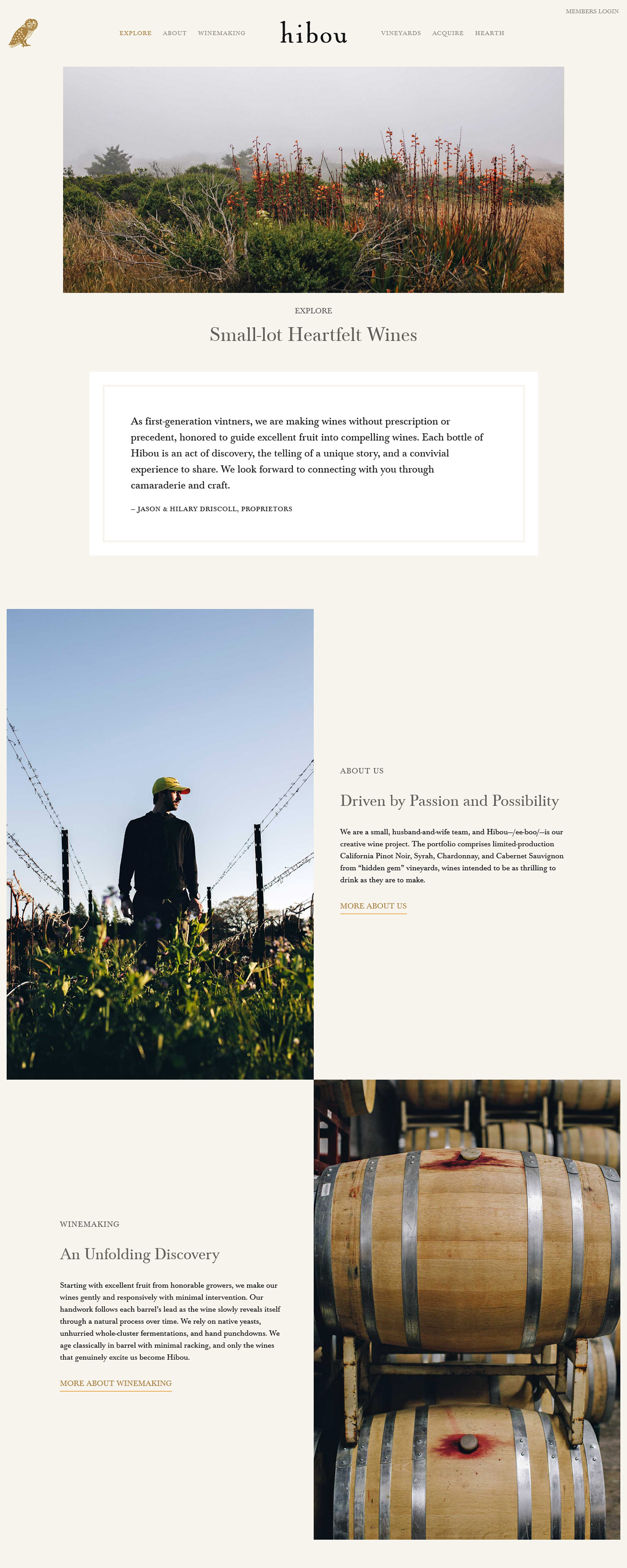 Hibou was an exciting young brand that lacked consistent engagement, due in part to a dark, static website that did not message the spirit of the undertaking. Partnering with Karen Fass of Feast Consulting and Christine Komons of Cru Creative, we designed a website that showcased fine art photography by Allison Watkins and integrated animated touches such as an owl pronouncing its French name (“ee-boo”).