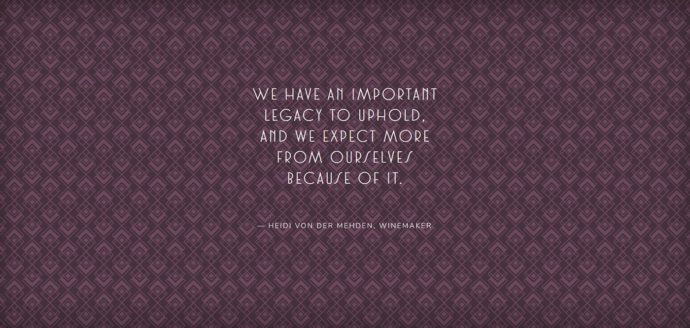 Then there was the matter of winery’s iconic Art Nouveau Revival watercolor labels, by Chez Panisse artist David Lance Goines. A throwback to a time when women earned the right to vote, they had recently been updated with fresh Art Deco-inspired typefaces. Inspired by these cues, we integrated 1920s-style patterns and decorative motifs into a powerfully feminine design.