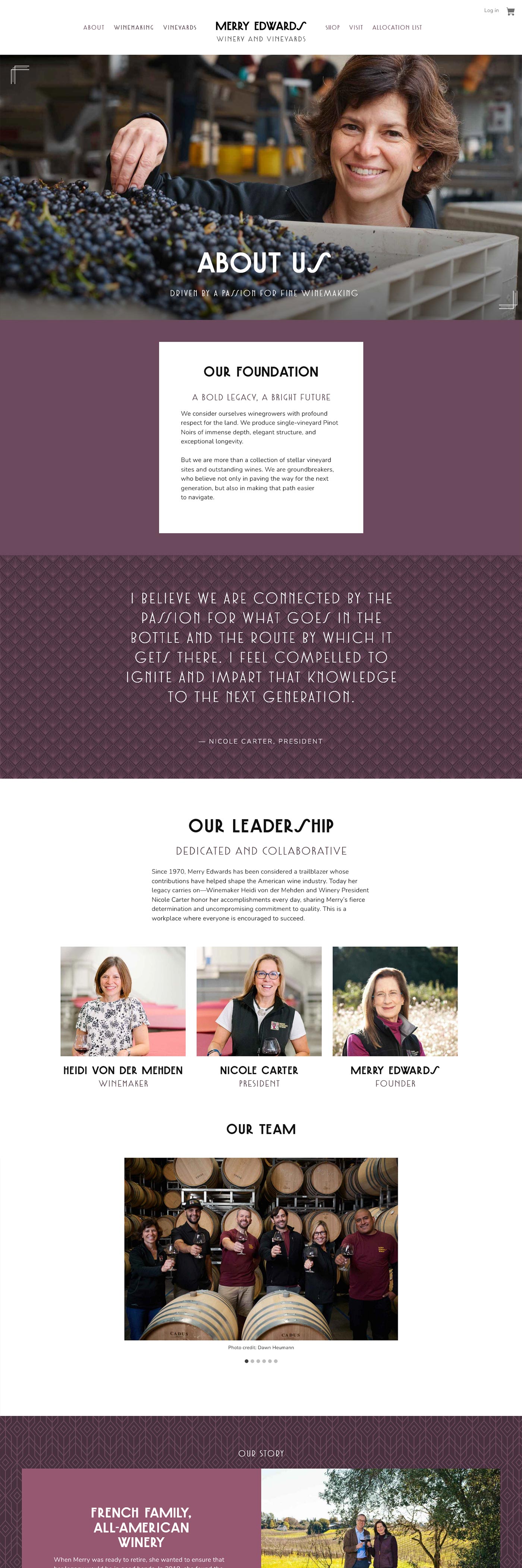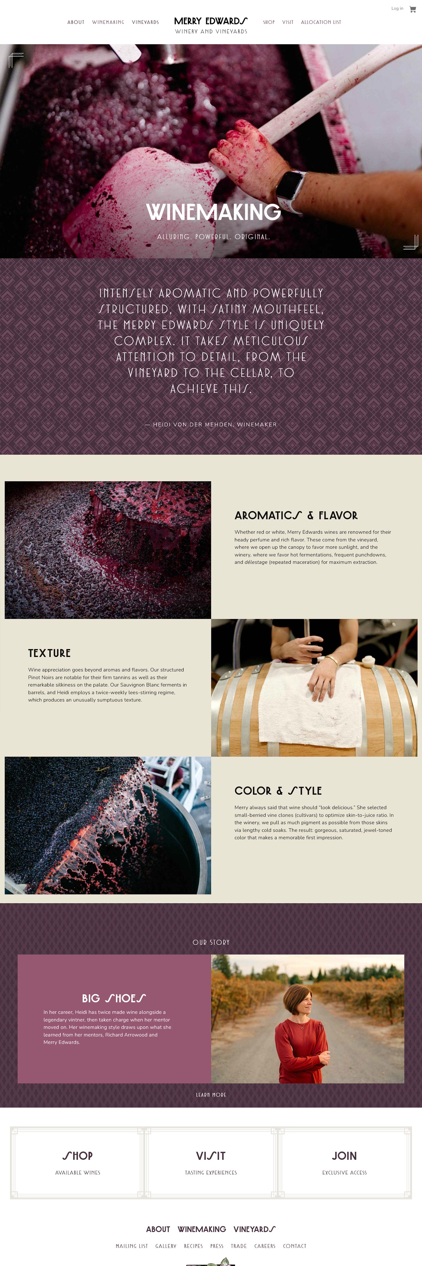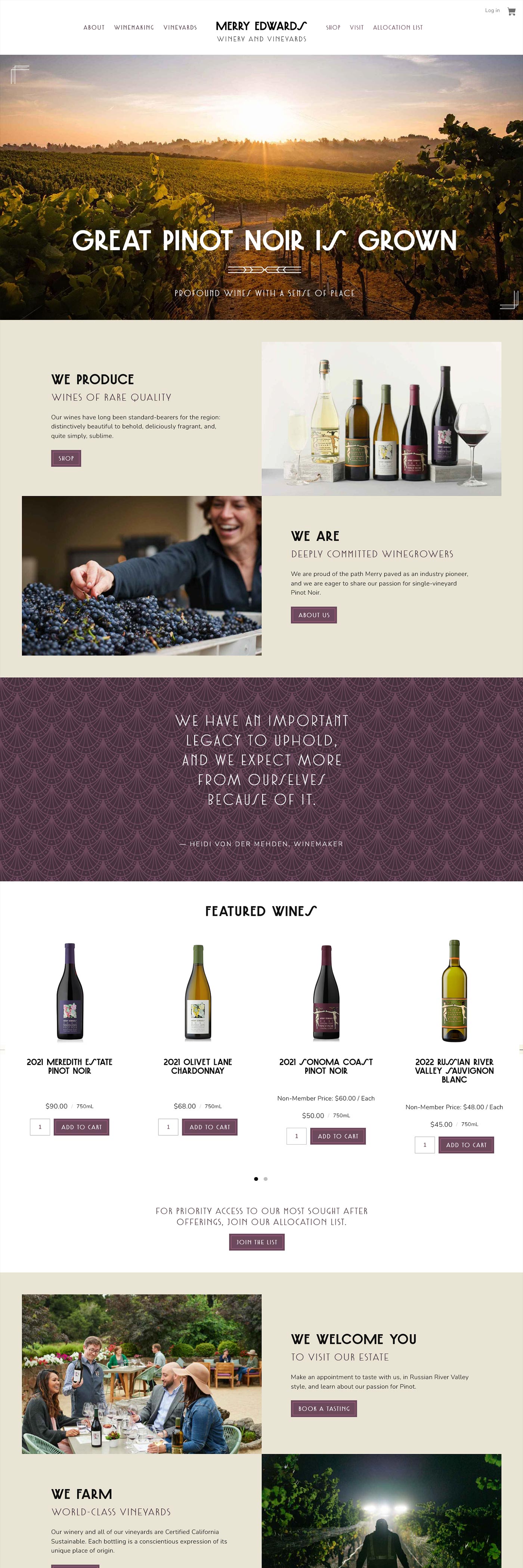 Under new ownership, Merry Edwards Winery & Vineyards was poised for a brand relaunch that would emphasize the future while honoring the accomplishments of its eponymous founder. In addition, while the winery’s distinctive Sauvignon Blanc has always been a bestseller, the new régime sought to underscore the quality of its terroir-driven Pinot Noirs. Finally, this legendary brand was ready to embrace a partially allocated DTC model.