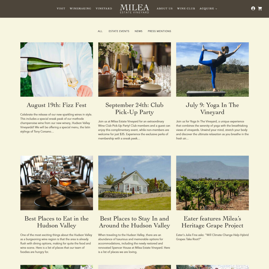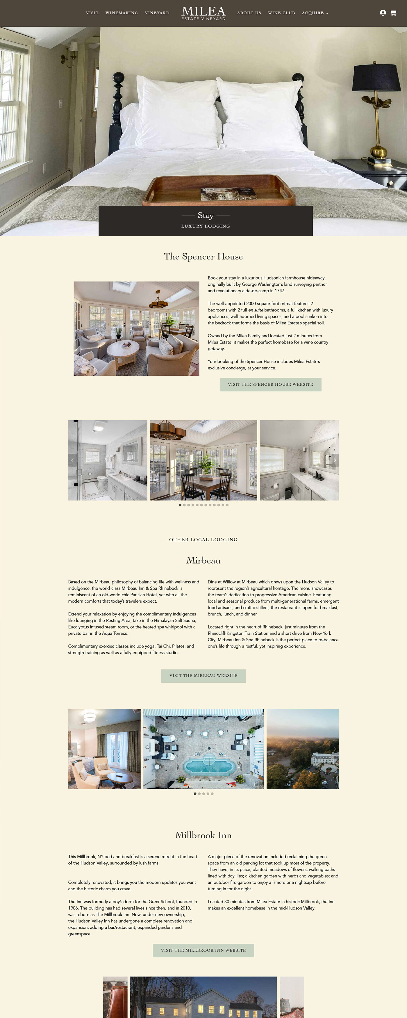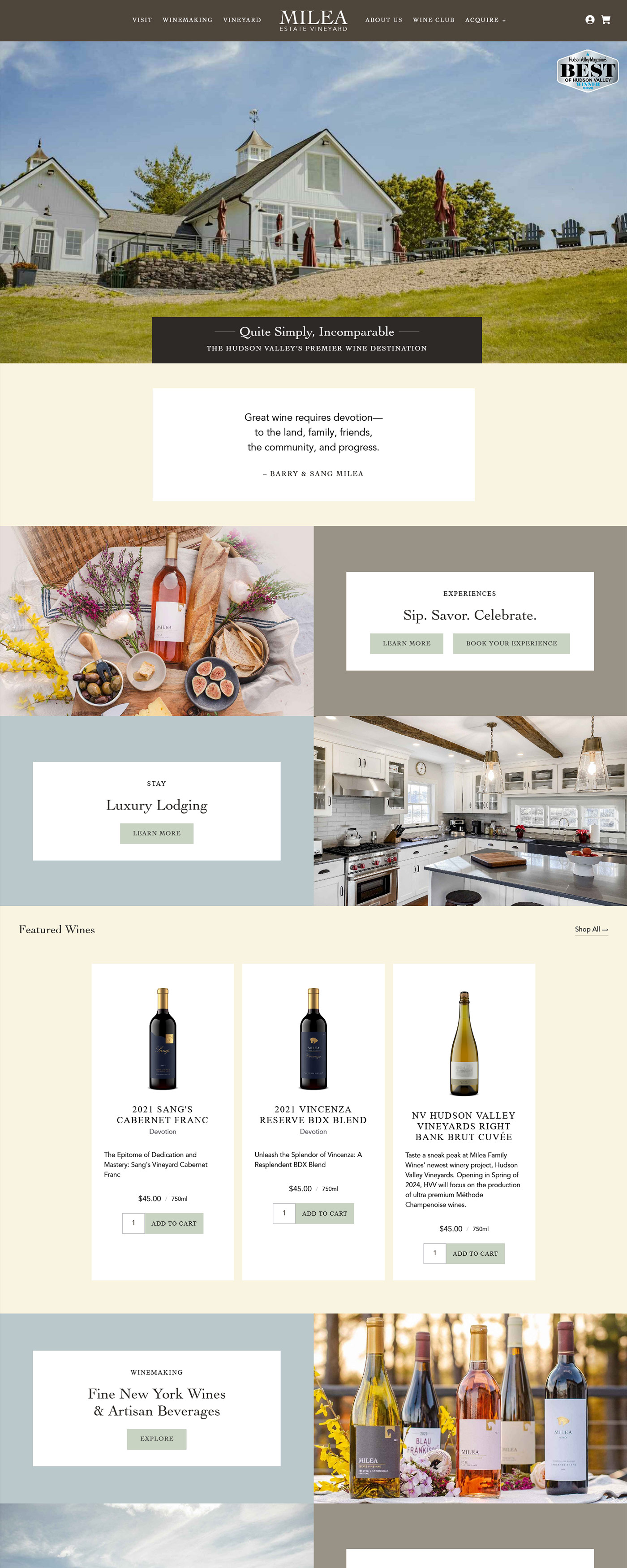 Milea Estate Vineyard is a winery, cidery, vineyard, and farm in New York’s Hudson River Valley. Offering luxury overnight accommodations and a refined hospitality experience, it’s fast becoming a sought-after getaway destination. In addition to a wide array of fine wines and an outstanding culinary program, Milea runs the Hudson Valley Heritage Grape Project, an array of wines supporting the conservation of indigenous grape varieties and historic cultivars.