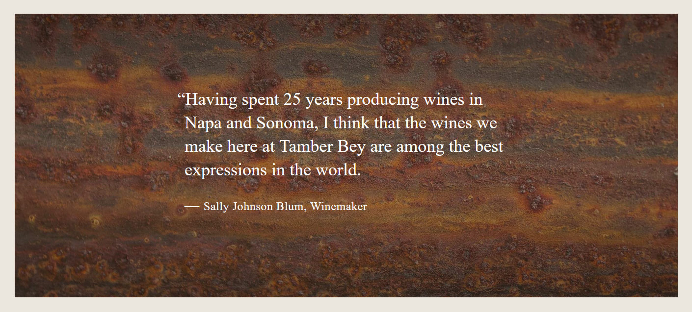 Barry Waitte is the president of the Oakville Winegrowers Association and owner of Tamber Bey. His wife Jennifer Waitte manages marketing for the winery, and daughter Kendra runs the wine club. Thomas Rivers Brown designed the wine program and the state-of-the-art winery; highly regarded winemaker Sally Johnson Blum, previously of Robert Mondavi, vinifies fruit from two estate vineyards plus a handful of select partner vineyards.