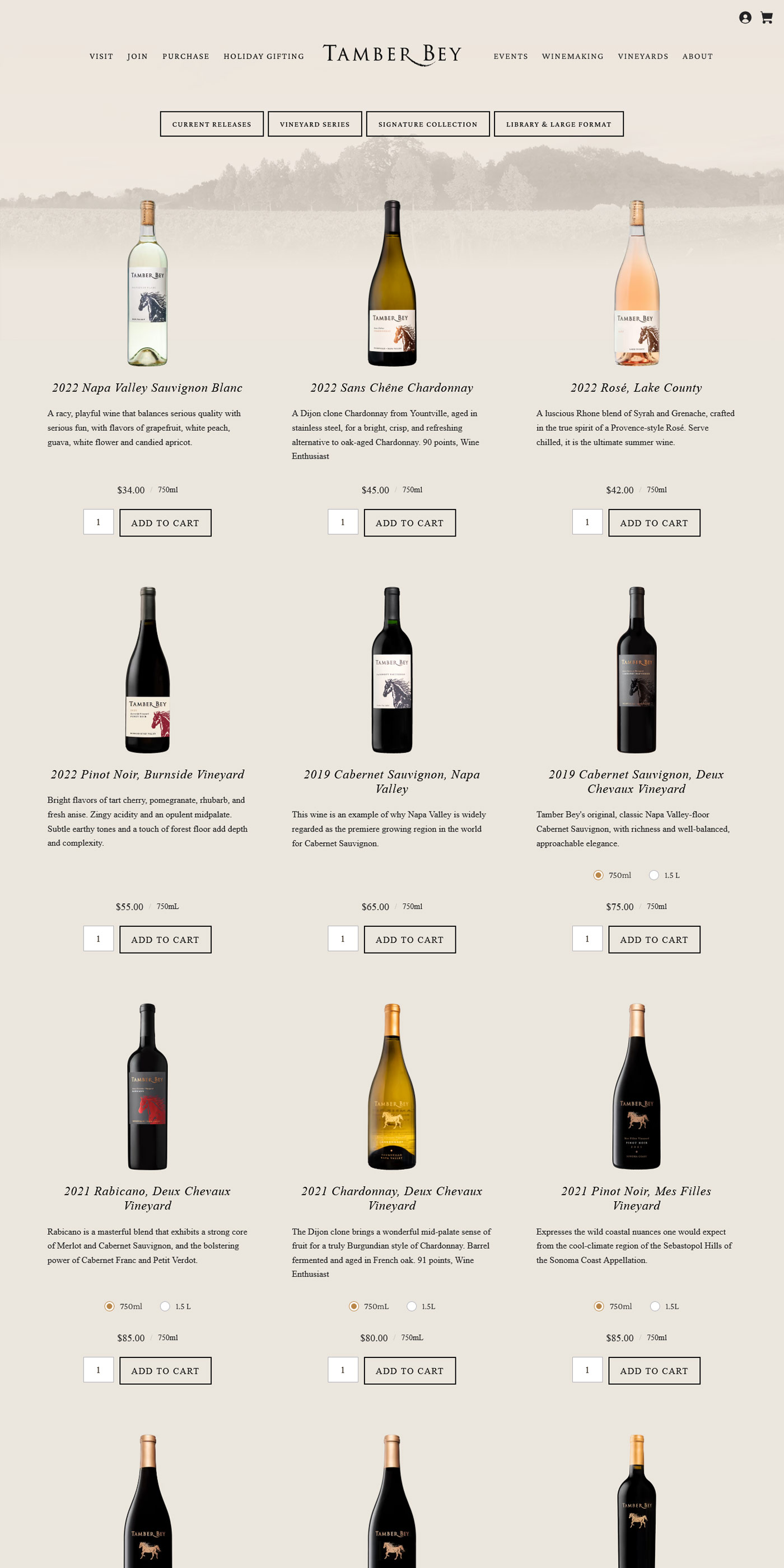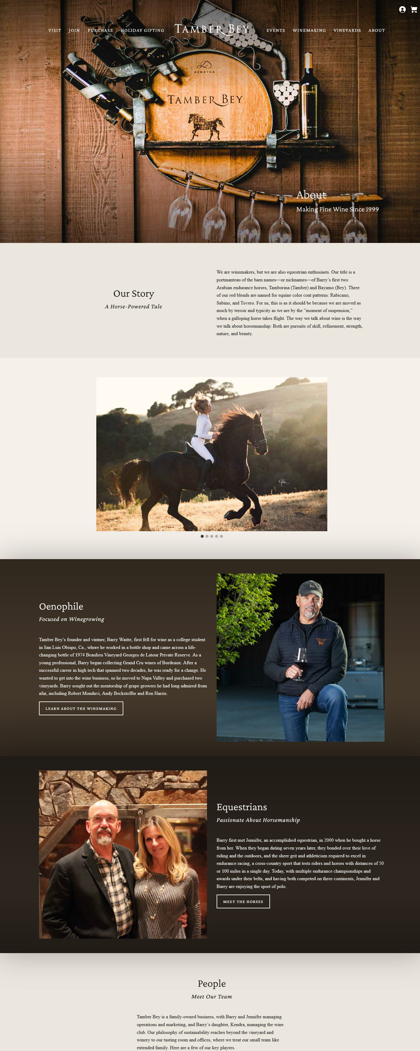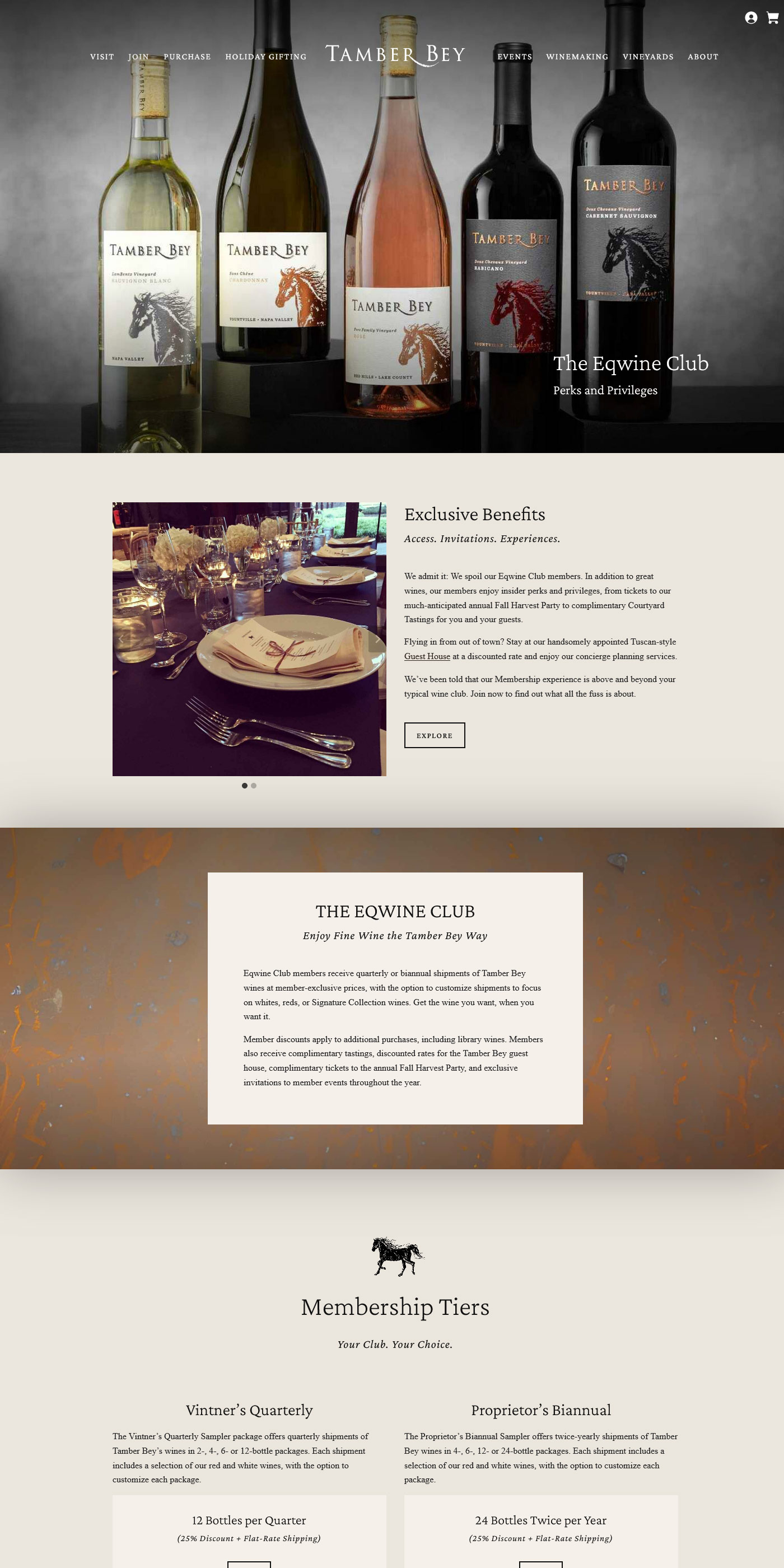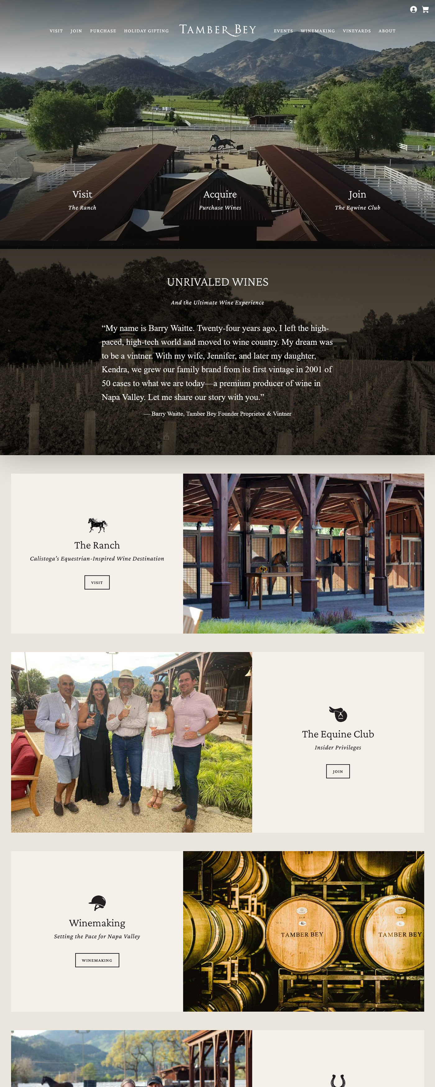 Vin designed a new Tamber Bey website that focused first on enjoying fine wine. We presented the offerings clearly, organizing and categorizing a new Commerce7 storefront and embedding bottle images into handsome page designs. In addition, after studying luxury brands—such as Ferrari and Hermès—that incorporate iconography from horsemanship, we pulled in equestrian silhouettes and textures to create a sense of an enhanced wine experience, rather than a horse experience that happened to include wine.