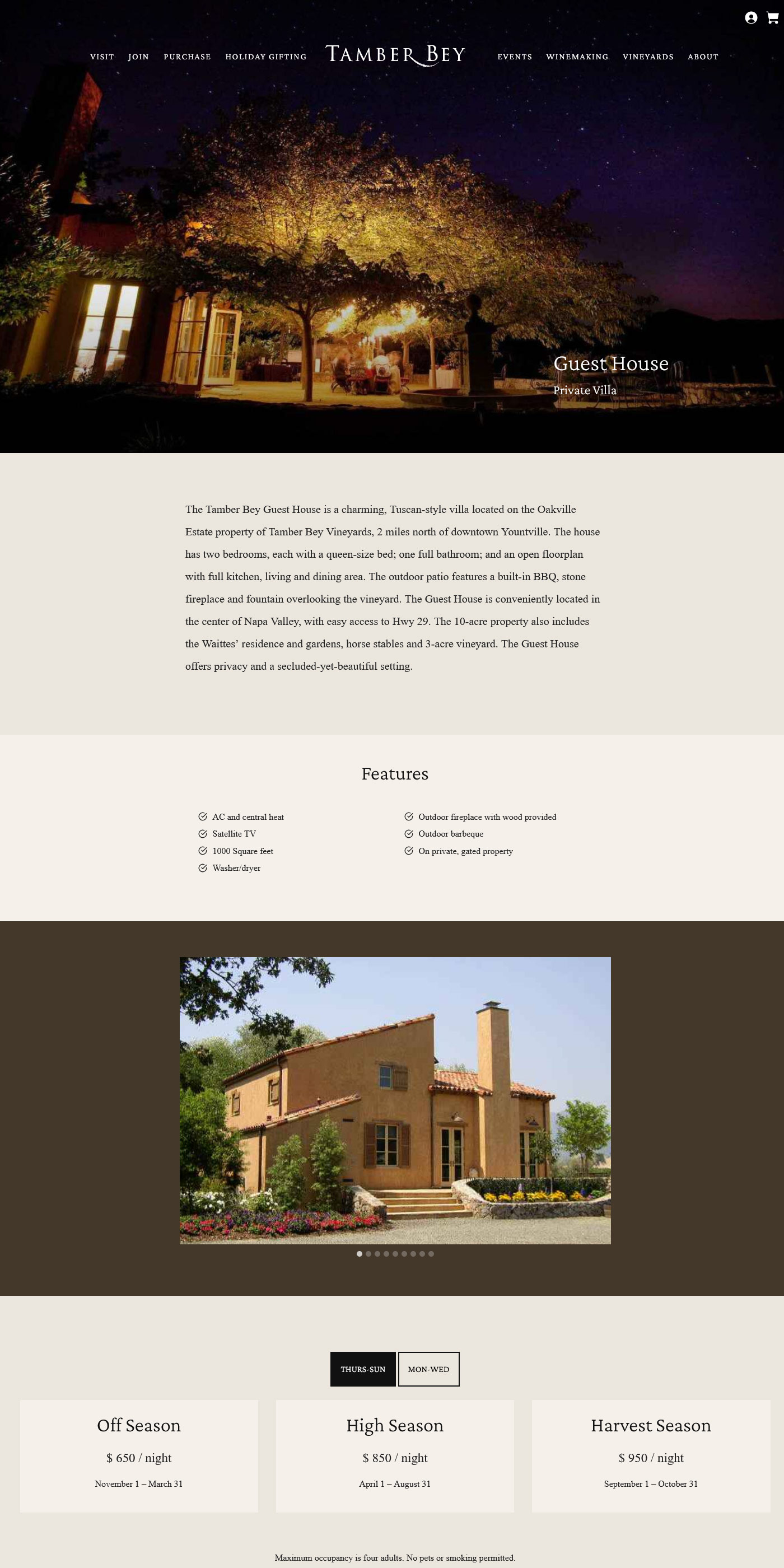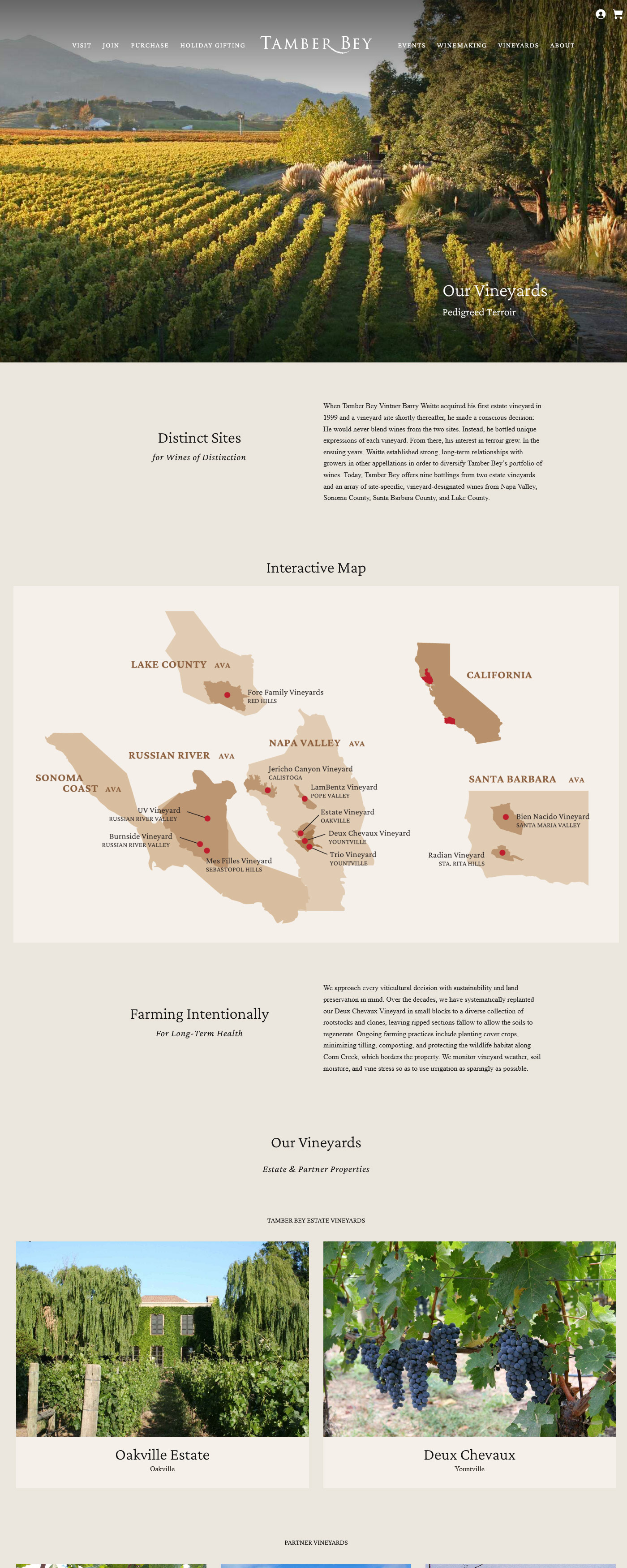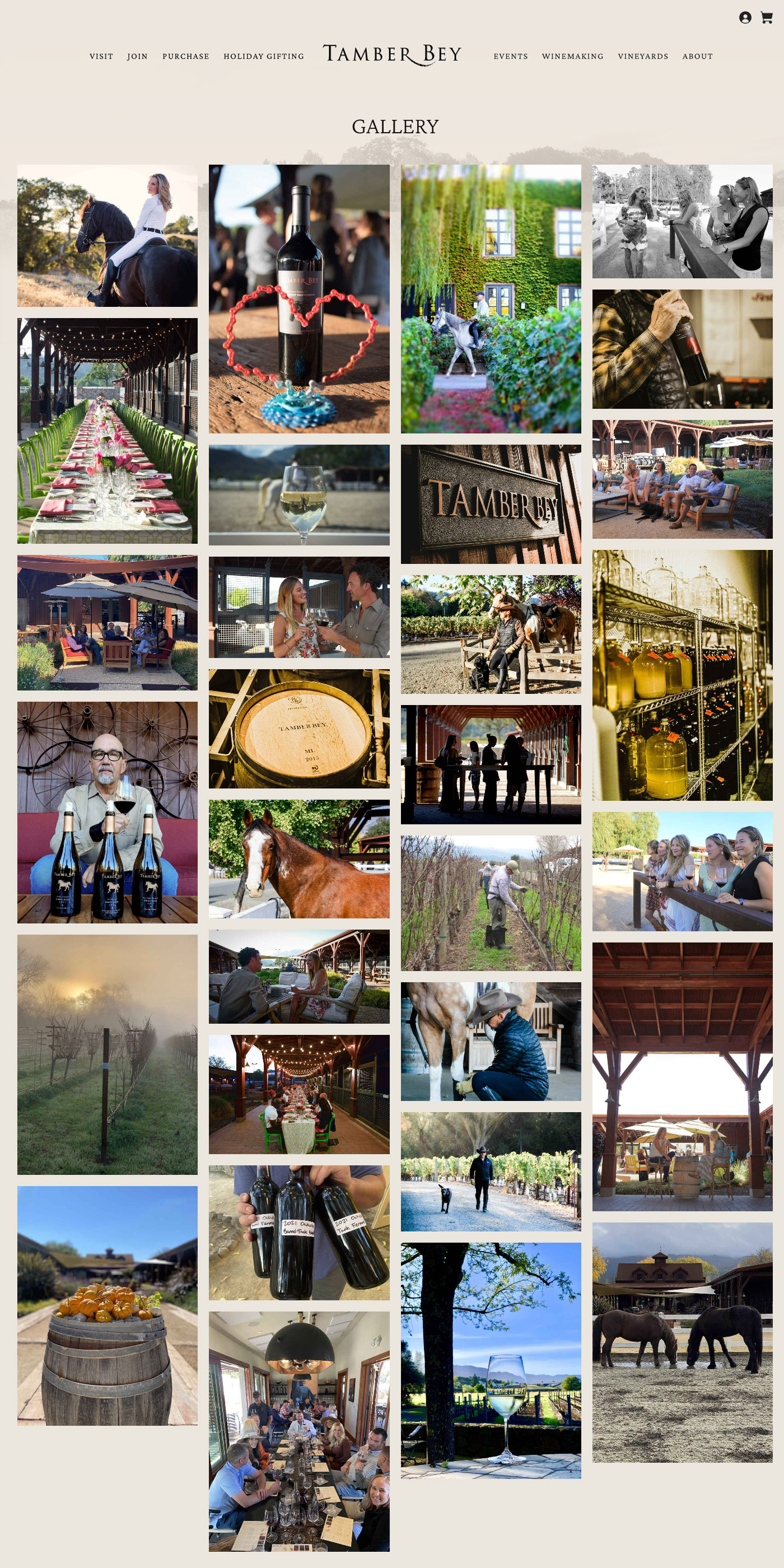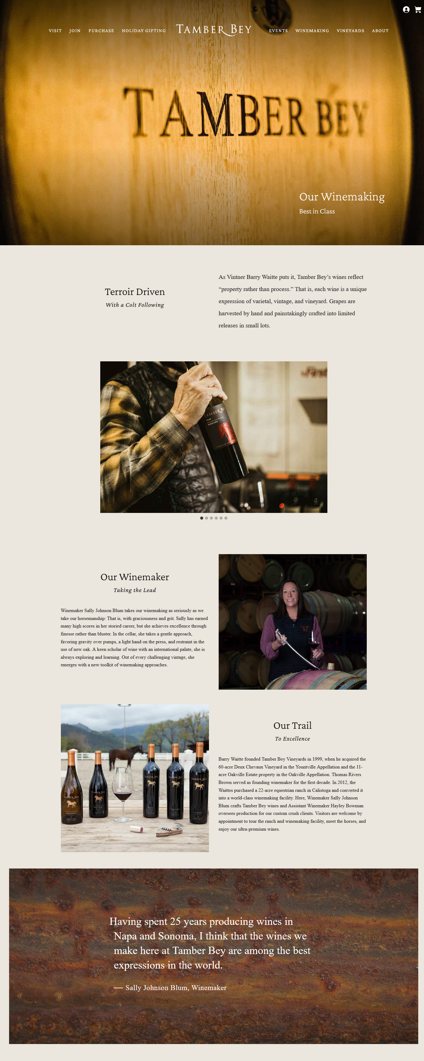 Vin designed a new Tamber Bey website that focused first on enjoying fine wine. We presented the offerings clearly, organizing and categorizing a new Commerce7 storefront and embedding bottle images into handsome page designs. In addition, after studying luxury brands—such as Ferrari and Hermès—that incorporate iconography from horsemanship, we pulled in equestrian silhouettes and textures to create a sense of an enhanced wine experience, rather than a horse experience that happened to include wine.