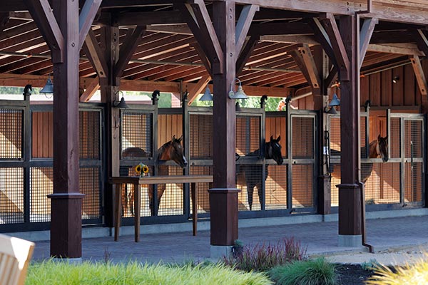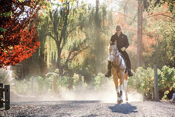 The stately tasting barn, designed by renowned architect Howard Backen, is part of a working horse farm. A jewel of Calistoga, the property reflects Jennifer’s and Barry’s backgrounds in endurance racing, dressage, and now, polo. “Tamber Bey” is a portmanteau of the names of owner Barry’s first two Arabian endurance horses, Tamborina (Tamber) and Bayamo (Bey).